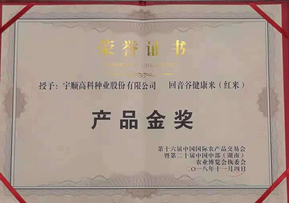 我司自主研發(fā)生產(chǎn)的“回音谷健康米(紅米)”繼中國(guó)安徽名優(yōu)農(nóng)產(chǎn)品暨農(nóng)業(yè)產(chǎn)業(yè)化交易會(huì)榮獲參展產(chǎn)品金獎(jiǎng)之后,2018年11月4日,再次榮獲“第十六屆中國(guó)國(guó)際農(nóng)產(chǎn)品交易會(huì)暨第二十屆中國(guó)中部(湖南)農(nóng)業(yè)博覽會(huì)”產(chǎn)品金獎(jiǎng)。
